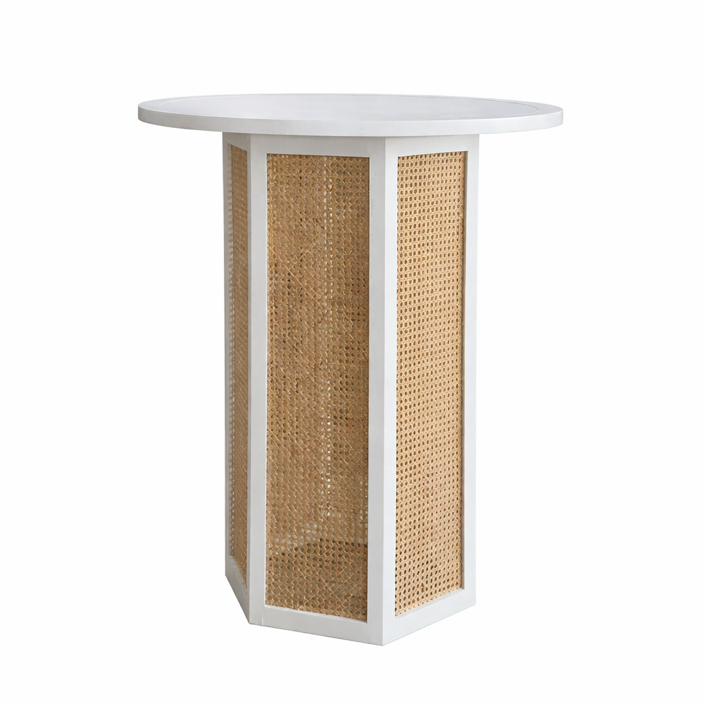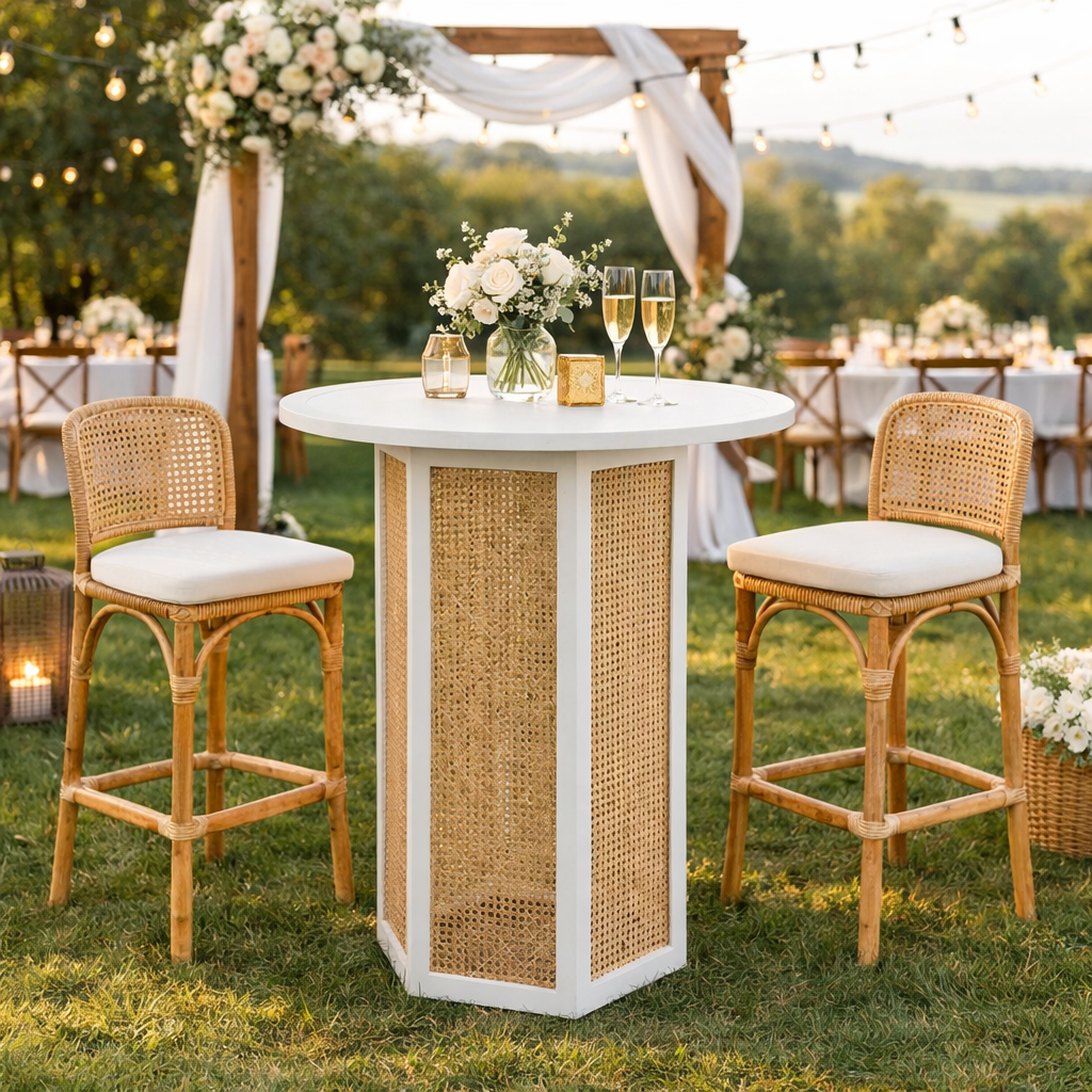 Štýlový barový stolík s bielou drevenou konštrukciou a prírodným ratanovým výpletom je ideálnym doplnkom pre moderné aj boho podujatia. Skvele sa hodí na svadby, garden party, firemné eventy, oslavy a podobne.
