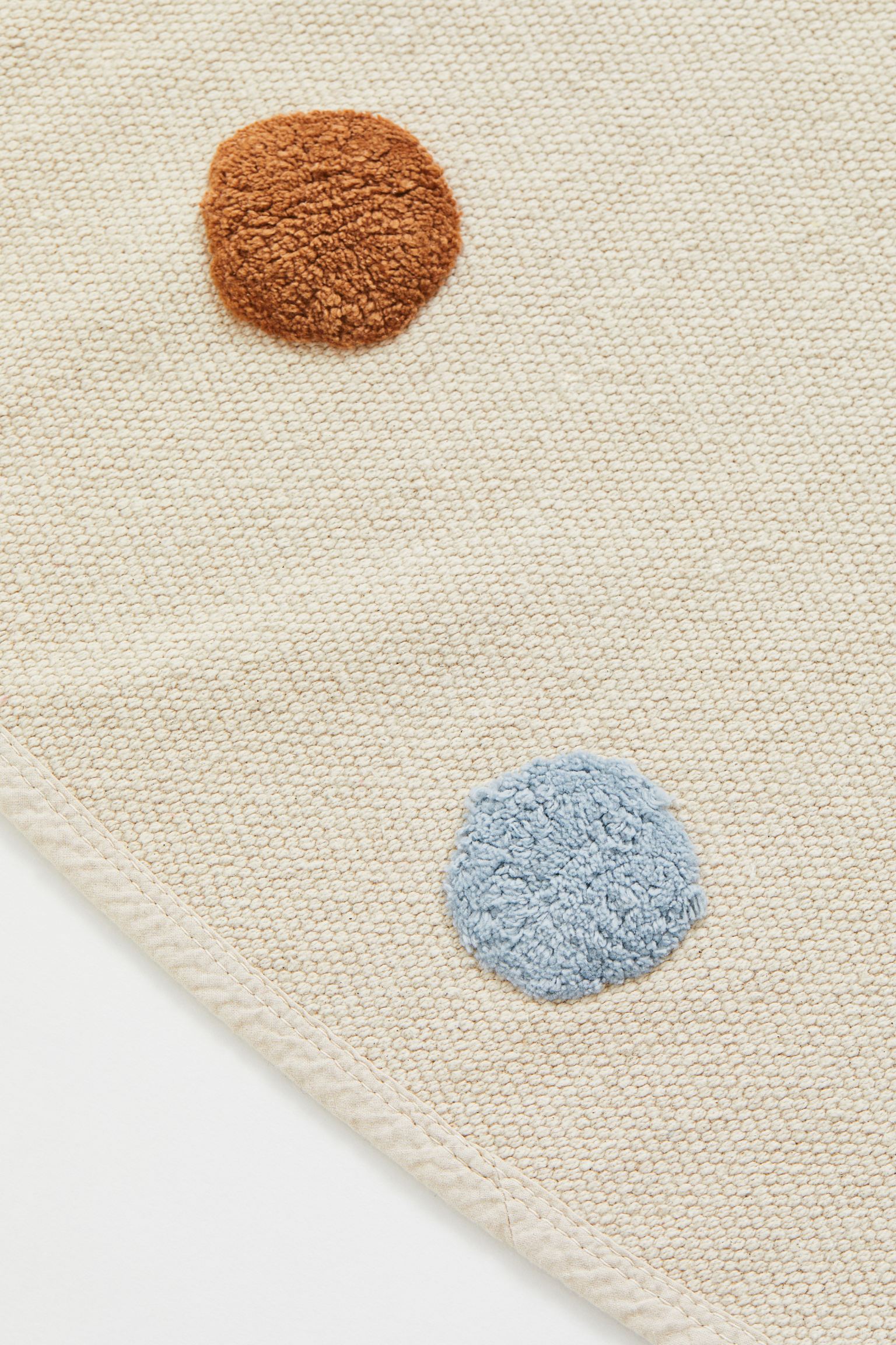 Okrúhly bavlnený detský koberec s chocholatými bodkami.