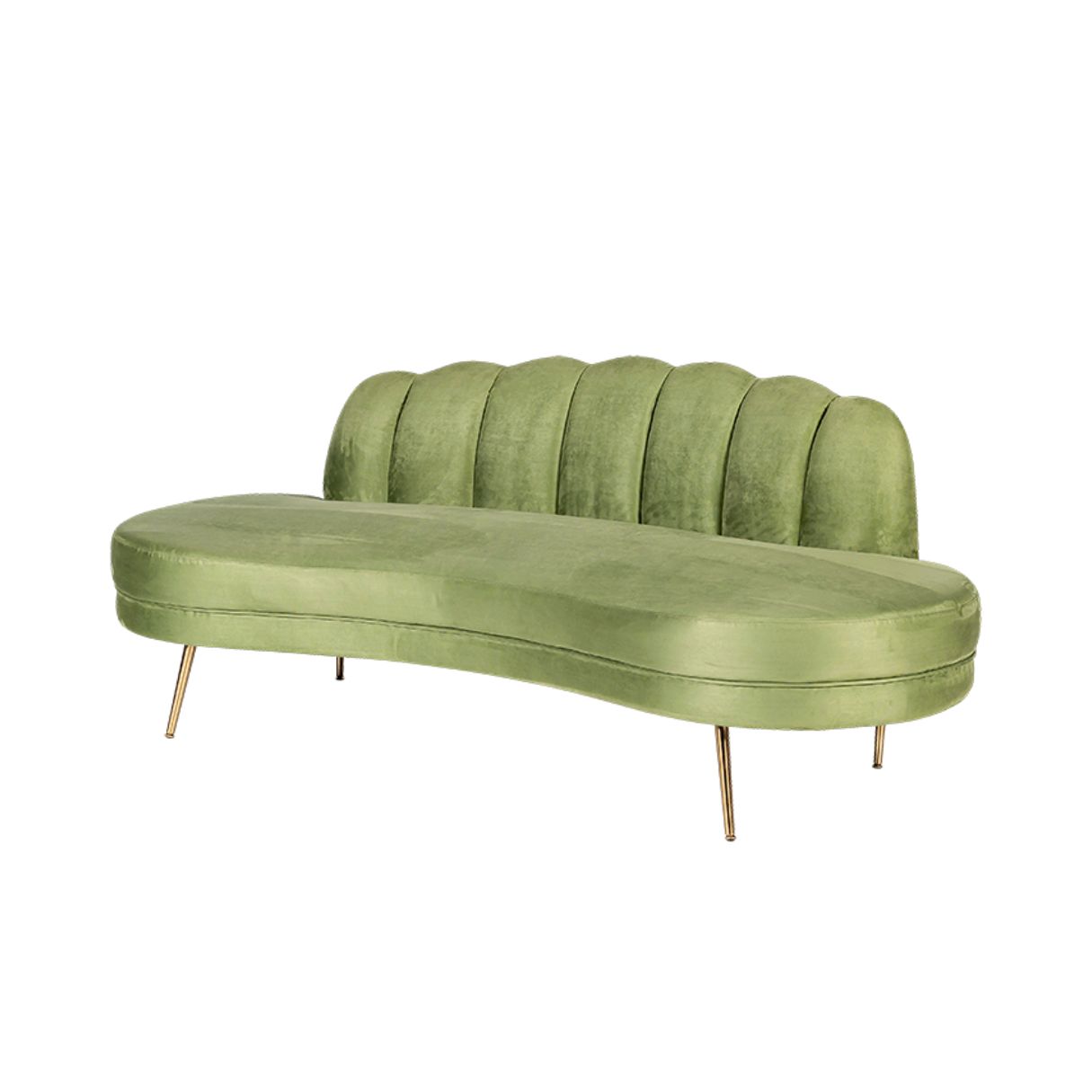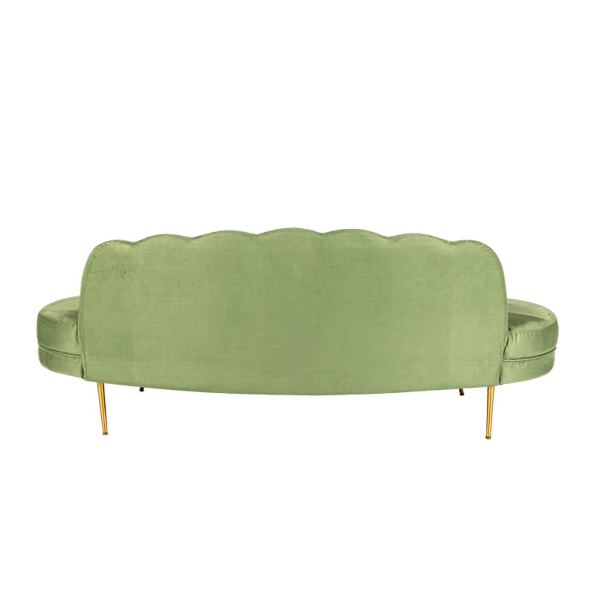 Moderná sedačka pre 3-4 osoby v štýlovom prevedení so zamatovou látkou a zlatými nohami z nerezovej ocele.